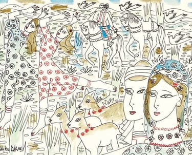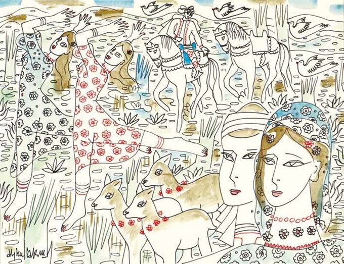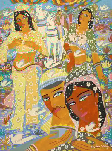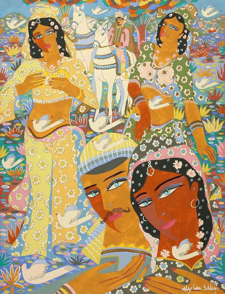 Aly Ben Salem’s art is renowned for its distinctive style, combining bold lines, vibrant colors, and a unique interpretation of Tunisian life. Influenced by Persian miniatures, his early works captured the beauty of local crafts and everyday scenes with both precision and poetic depth.