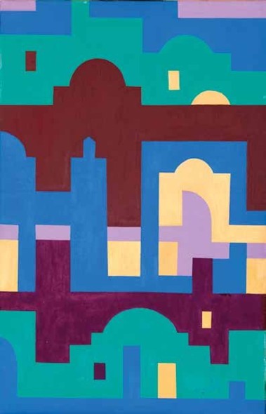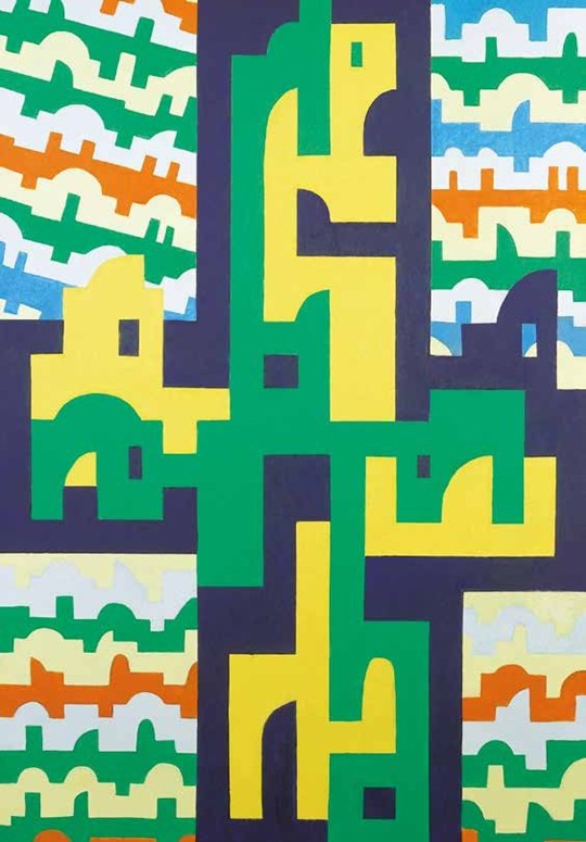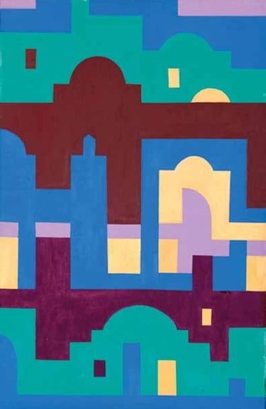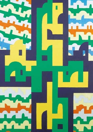 Belkhodja’s compositions feature interwoven lines and shapes inspired by the structure of the Medina’s streets, creating dynamic spaces of light and color that shift with the viewer’s perspective. Influenced by artists such as Klee, Delaunay, and Mondrian, he envisions his art as a convergence of architecture and Arabic script, often incorporating fragments of text as symbolic expressions of an inner voice. His deliberate use of color enhances the interaction between light and form, inviting optical illusions and deeper interpretations.