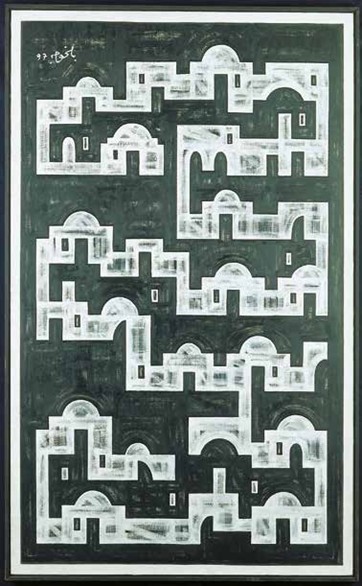 Nejib Belkhodja is a painter deeply engaged in the relationship between Tunisian identity and modern art. His work explores the integration of Arabic calligraphy and cultural symbols into contemporary aesthetics, with a particular focus on the Arabic letter—especially Koufi calligraphy—and the architectural elements of the Medina.